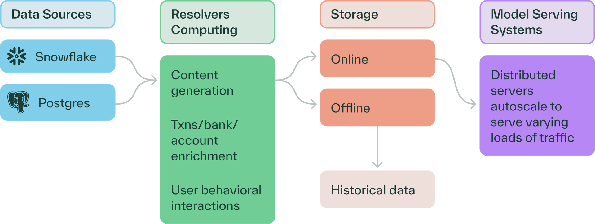 Chalk acts as the central feature platform between MoneyLion’s data infrastructure and real-time model serving systems. It abstracts feature computation, storage, and online serving behind a unified Python-first interface.